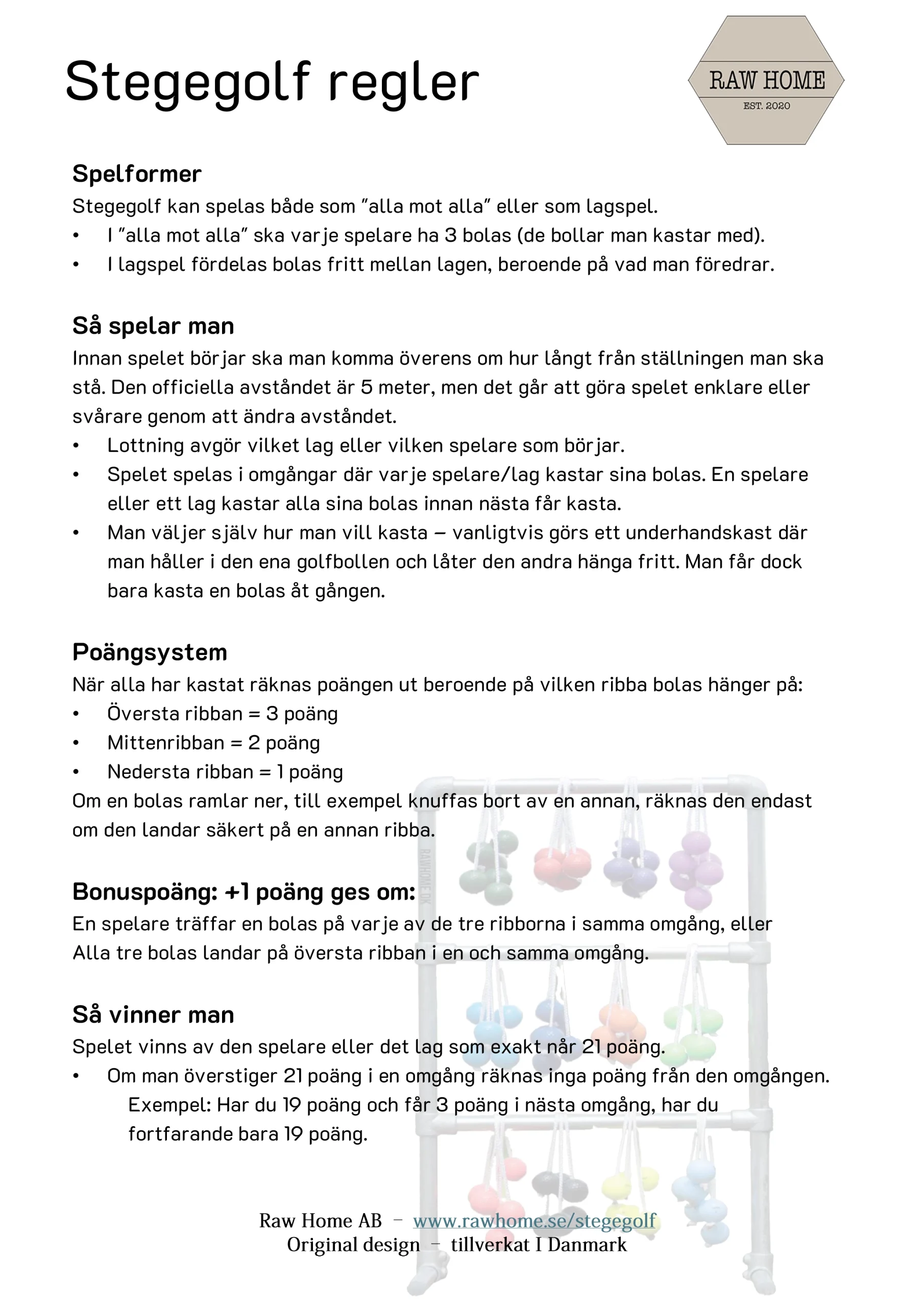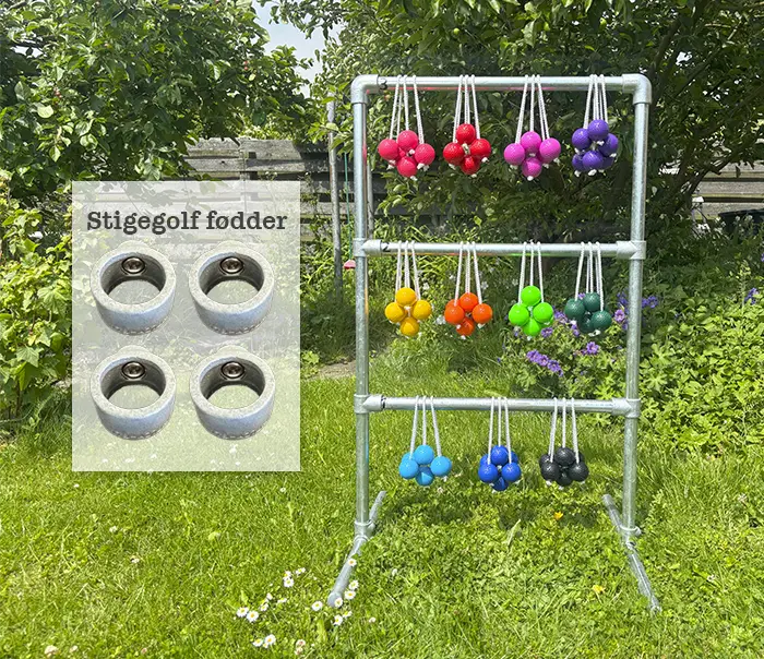 Stegegolf är ett enkelt och underhållande utomhusspel för både barn och vuxna. Det passar perfekt till sommarfester, familjedagar, företagsevenemang eller bara en rolig eftermiddag i trädgården. Spelet går ut på att kasta bolas (två golfbollar sammanbundna med ett snöre) och försöka träffa olika nivåer på ställningen – varje nivå ger olika poäng.